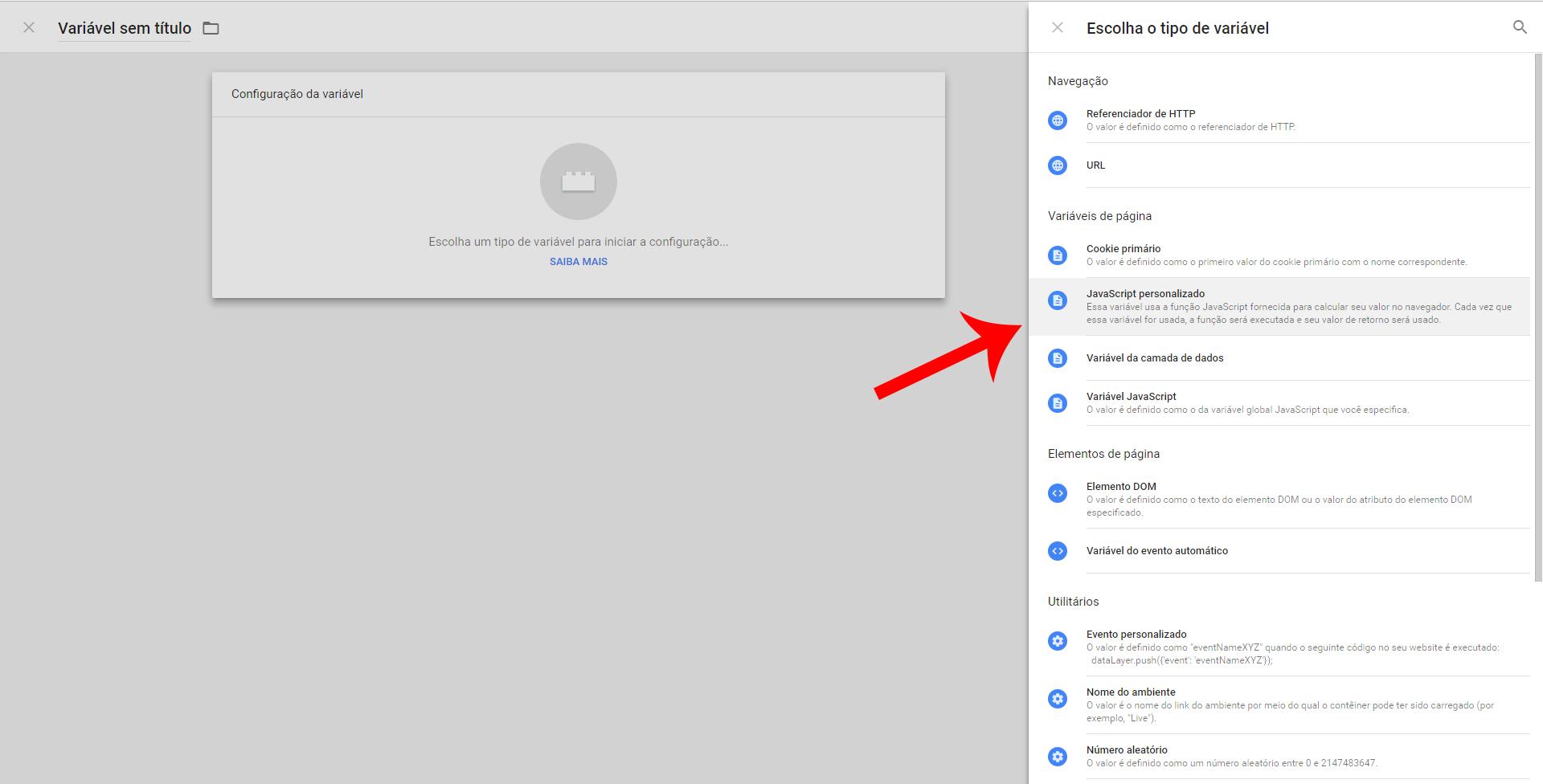 - Haga clic en Configuração da variável y elija el tipo JavaScript personalizado;