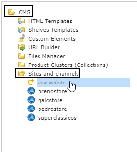 Storefront > Layout > Carpeta de CMS > Sites and Channels > New Website