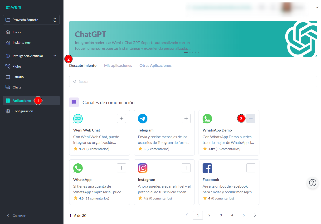 - En tu proyecto, haz clic en Aplicaciones > Descubrimientos > Añade WhatsApp Demo.