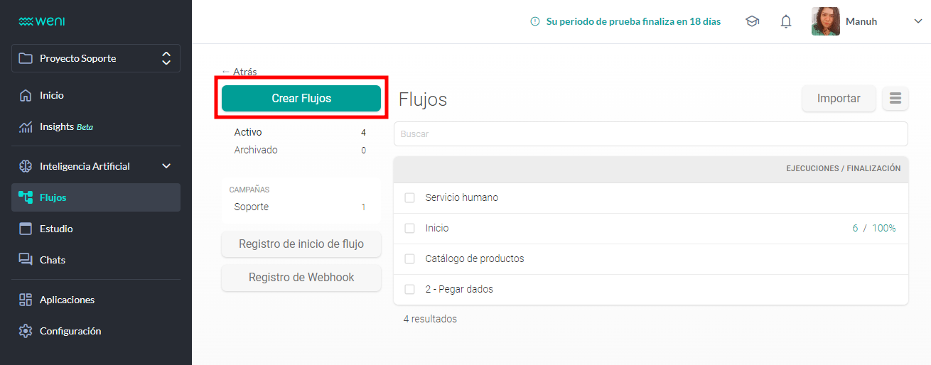 - Primero, vamos a hacer click en el botón de flows en el Menú lateral.