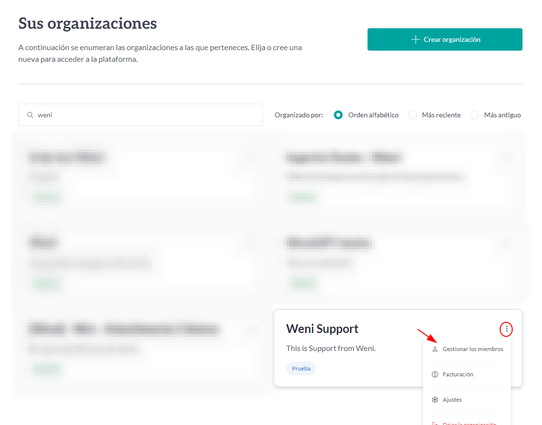Agregue miembros a su organización haciendo clic en el menú desplegable y luego en Gestionar miembros, vea la imagen: