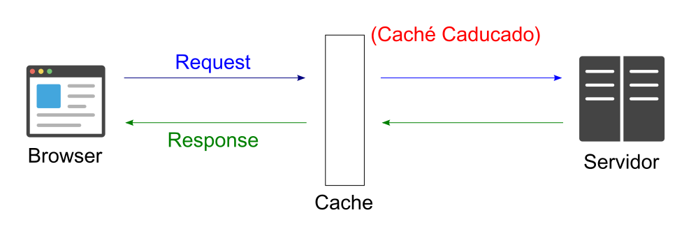 Cuando el cache de un request (página o archivo) expira, al realizar una nueva solicitud, o sea, al cargar nuevamente la URL, el sistema va al servidor, rescata la información actualizada para aquella solicitud y actualiza el contenido de aquella URL en el cache. Después de actualizada, la versión cacheada vuelve a ser retornada para nuevas solicitudes de URL. Vea el esquema ilustrando ese caso: