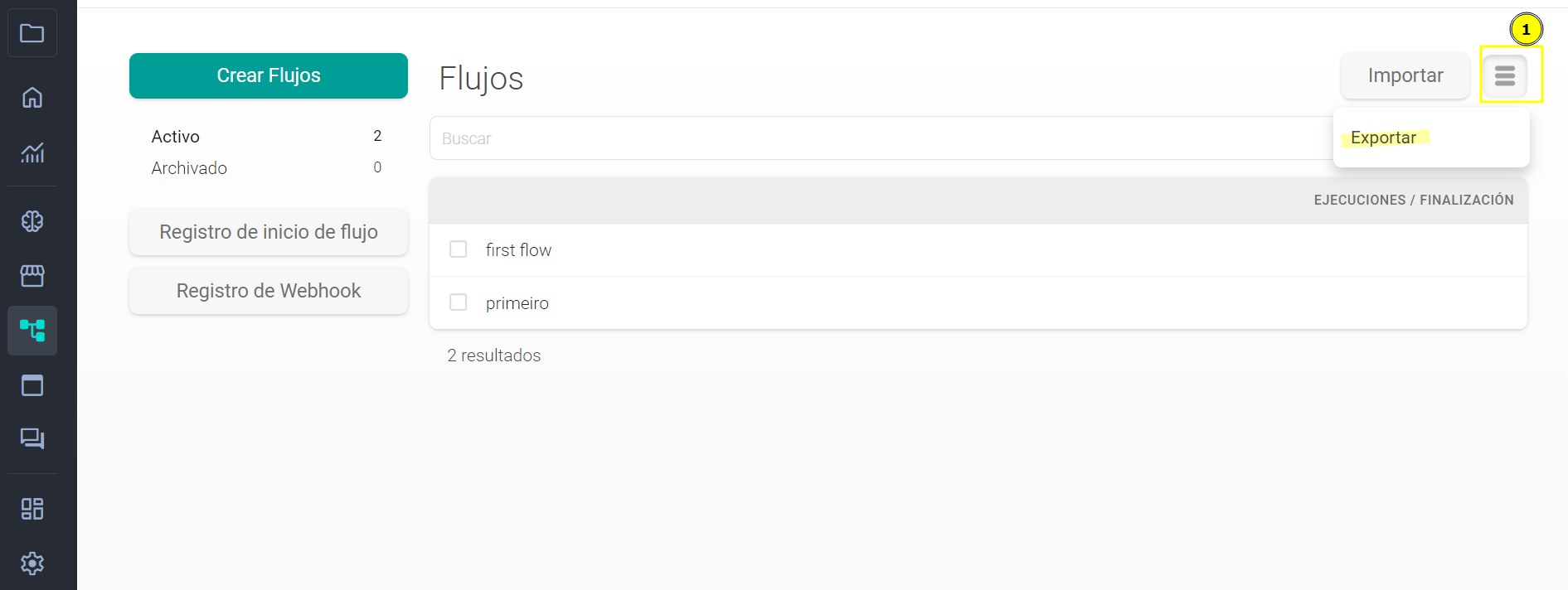 Para exportar los flujos deseados, simplemente selecciona los que te interesen y luego haz clic en el botón ""Exportar"" al final de la página, esto generará un archivo .json que podrás utilizar en la siguiente etapa, la importación.