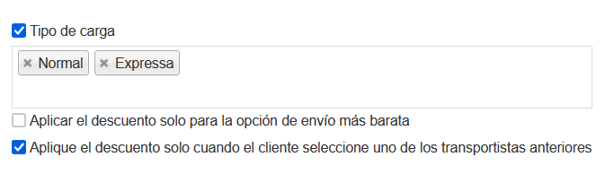 Si habilita las opciones Tipo de carga y Aplique el descuento solo cuando el cliente seleccione uno de los transportistas anteriores y selecciona los tipos de flete deseados, el descuento de flete se aplicará a todos los tipos de flete seleccionados solamente cuando el cliente elija el tipo de flete en el checkout.