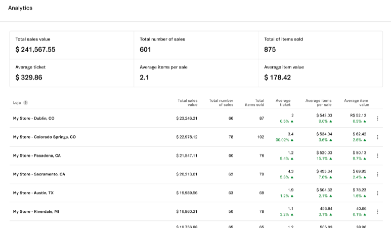 - Valor total de las ventas: mostrará el valor total de las ventas de la tienda para los periodos seleccionados en el campo **Mostrar ** (azul) y el campo Comparado con (gris), indicando el porcentaje de aumento o disminución de las ventas en esta comparación.