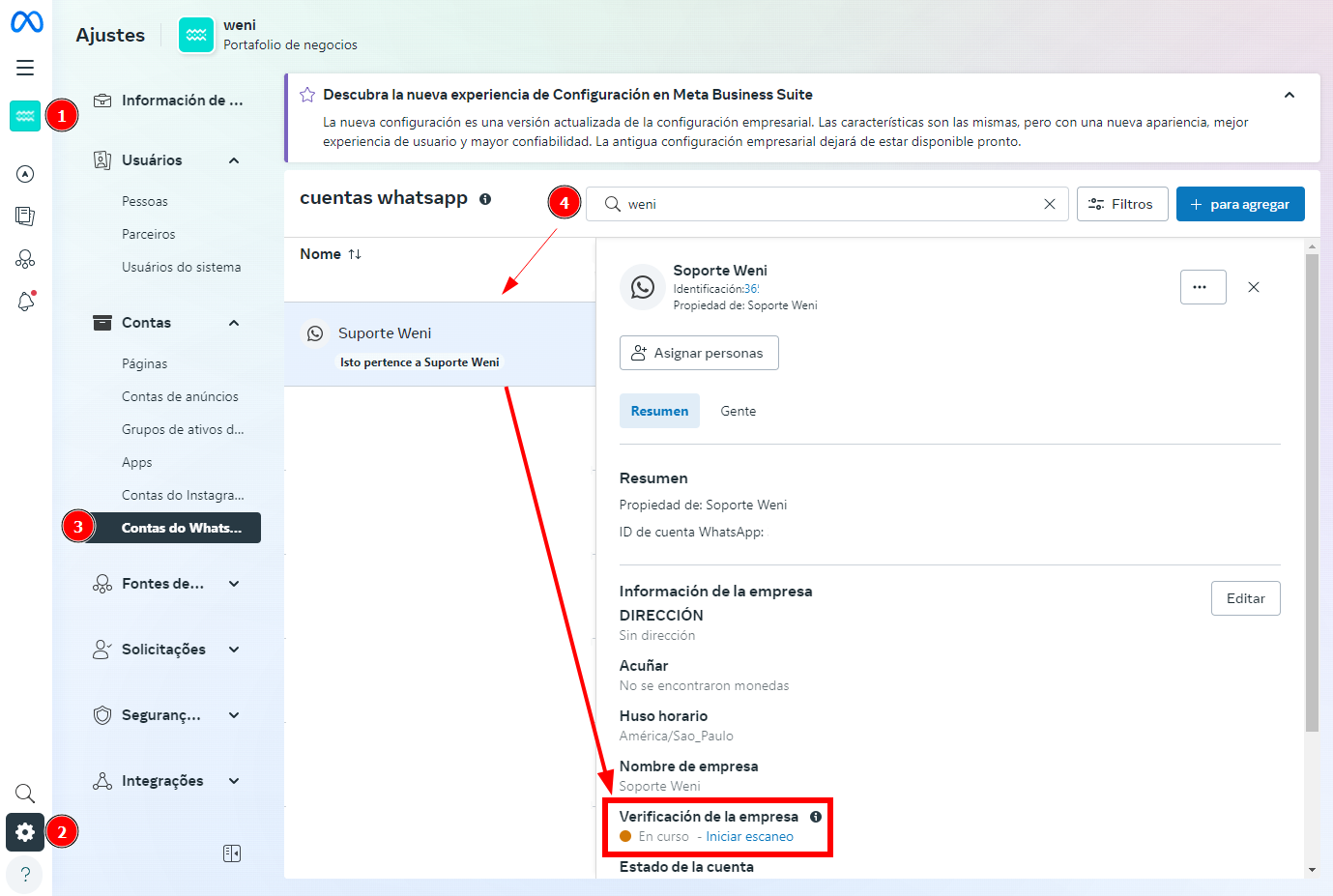 Si ya has integrado tu número en nuestra plataforma a través del Menú Integraciones > Mis Aplicaciones o si se ha aceptado el vínculo entre tu Meta Business y Weni, el botón Iniciar verificación estará disponible para ti en la nueva página que se abre al hacer clic en Ver Detalles.