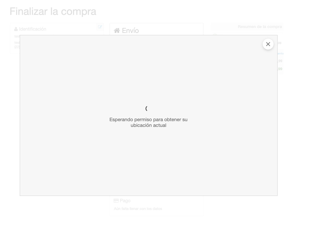 Durante el checkout, si la ubicación del cliente se obtiene mediante el permiso de ubicación del navegador, el mapa se queda cargando y muestra el mensaje «Esperando permiso para obtener su ubicación actual».