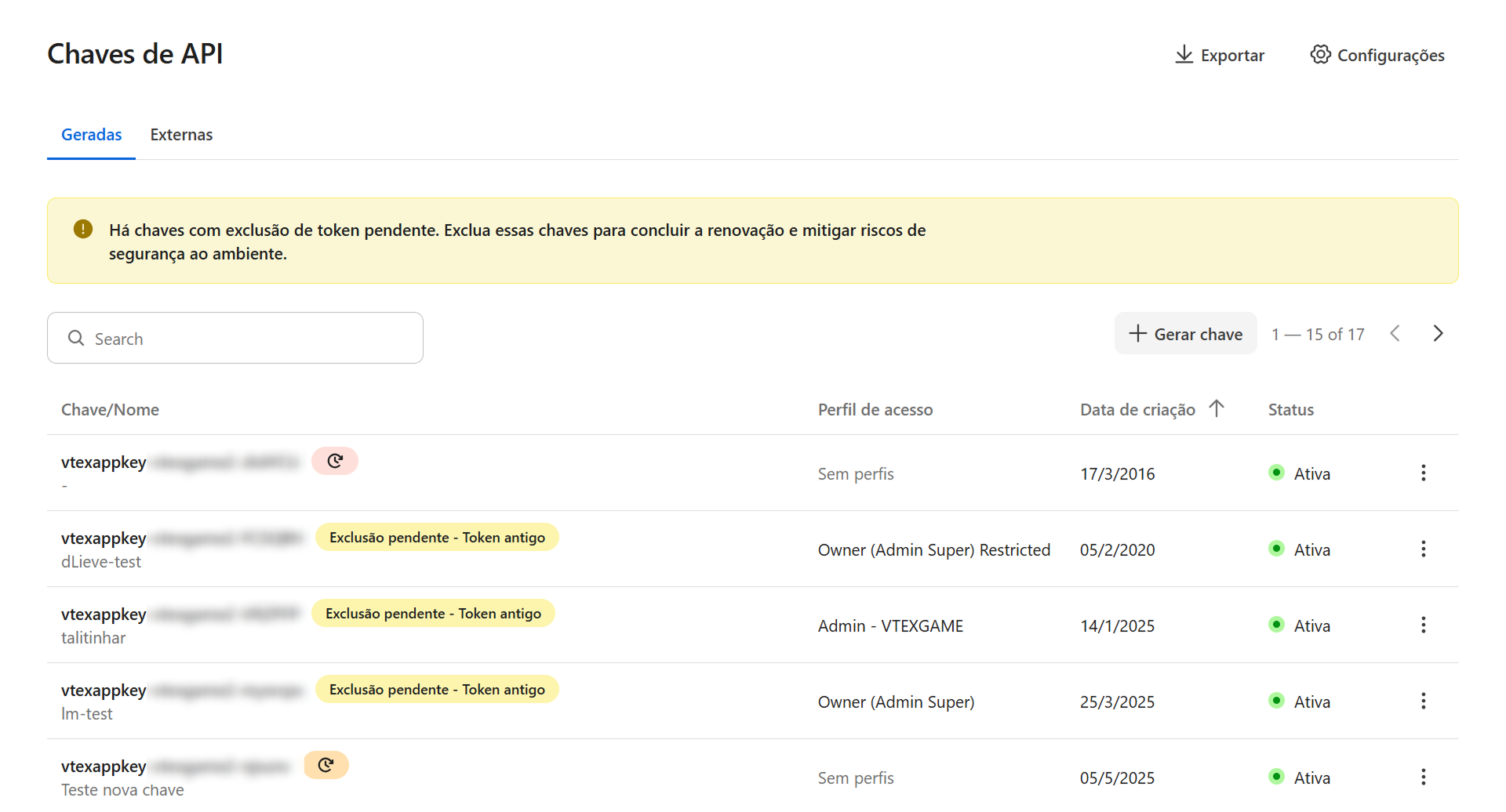 Claves generadas: permite gestionar las claves de API creadas y administradas por tu cuenta VTEX.