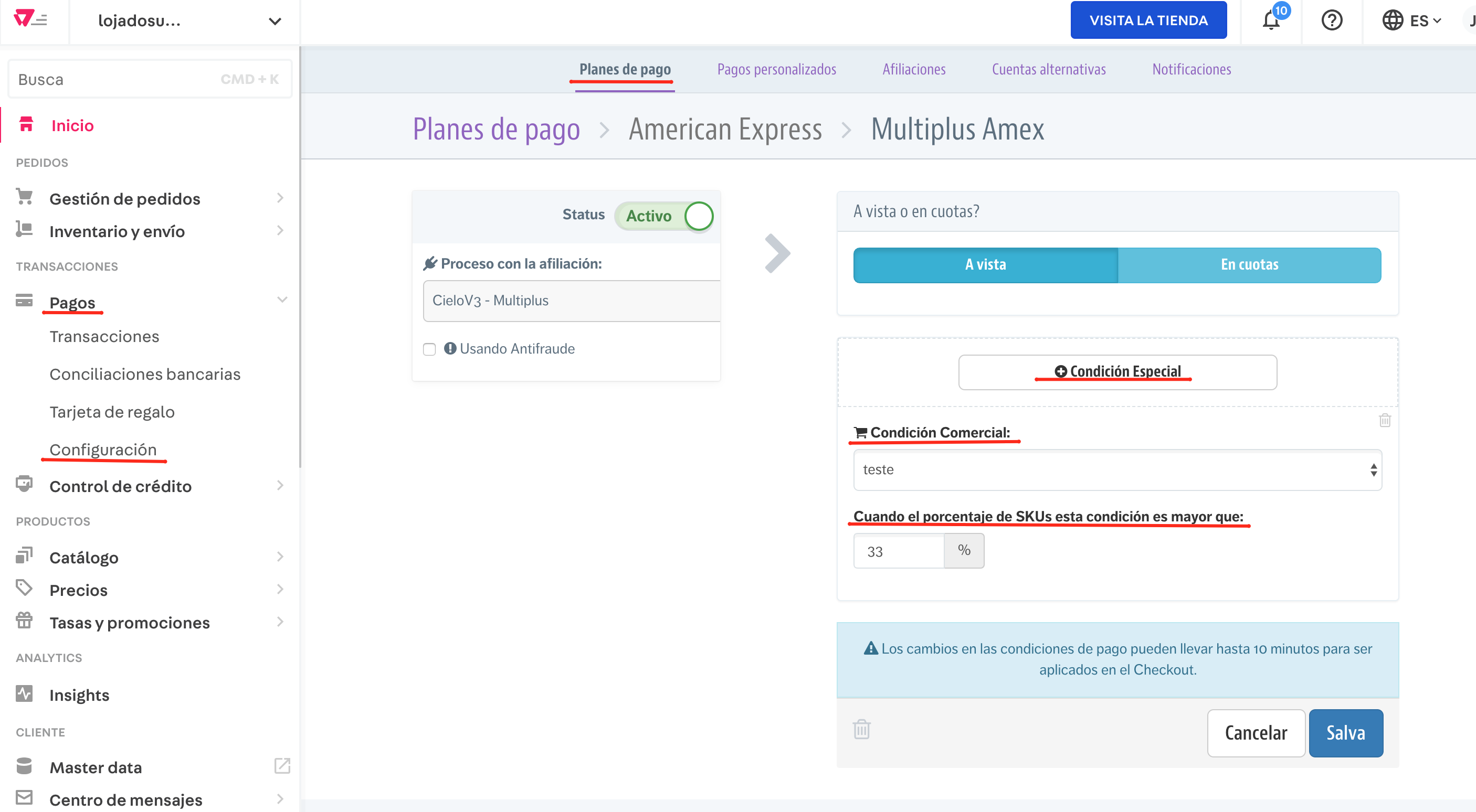 Las condiciones de pago poseen un caché de hasta 10 minutos en el Smart Checkout. Luego, cualquier cambio en las Condiciones de Pago del modulo Pagos puede llevar hasta 10 minutos para entrar en producción en el Smart Checkout.