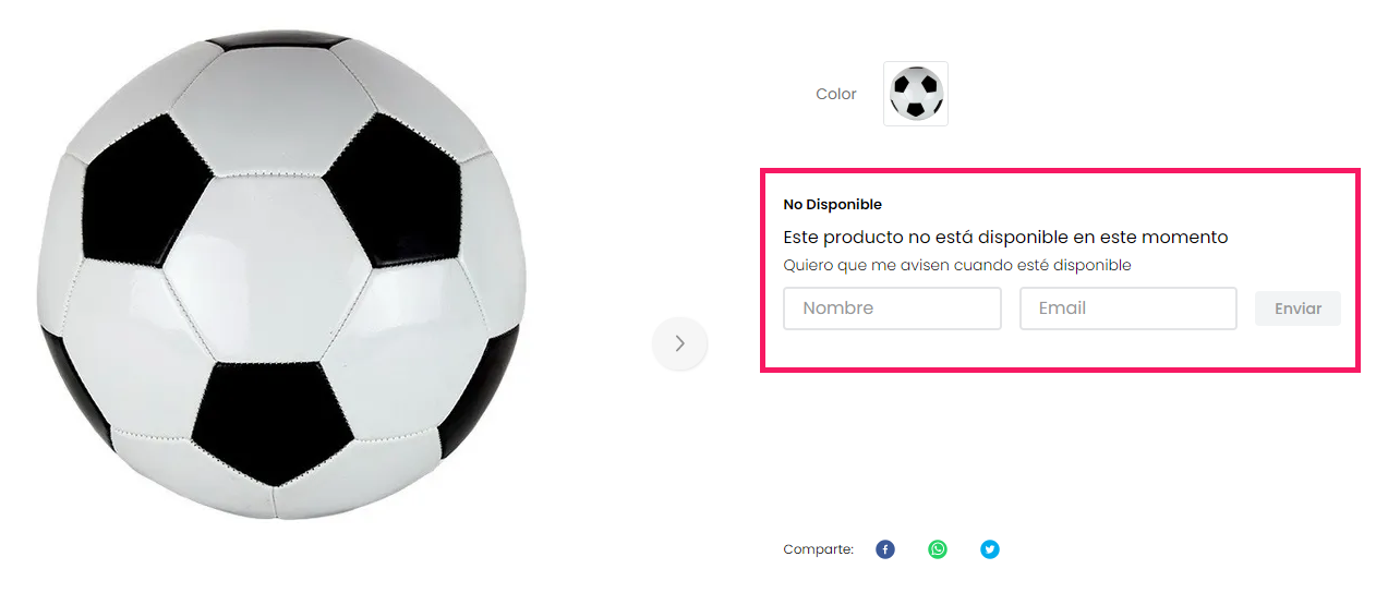 Cuando no hay stock de un producto, el administrador de la tienda puede optar por ofrecer al cliente la opción Avísame. Esta funcionalidad permite que los clientes interesados en un producto reciban una notificación por email cuando el ítem vuelva a estar disponible.