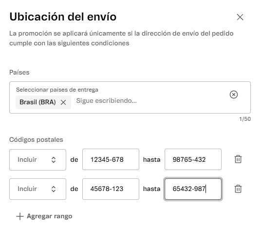 • Código postal de entrega: permite configurar rangos de códigos postales para limitar la aplicación de la promoción a regiones específicas.