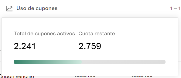 Uso (cupones sencillos): muestra el número de usos del cupón y el número de usos restantes, en caso de que hayas limitado la cantidad de usos.