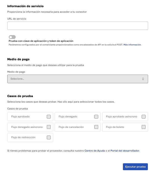 Luego, verás un formulario que tiene tres secciones: Información de servicio, Medio de pago y Casos de prueba. Rellena los campos según las instrucciones a continuación.