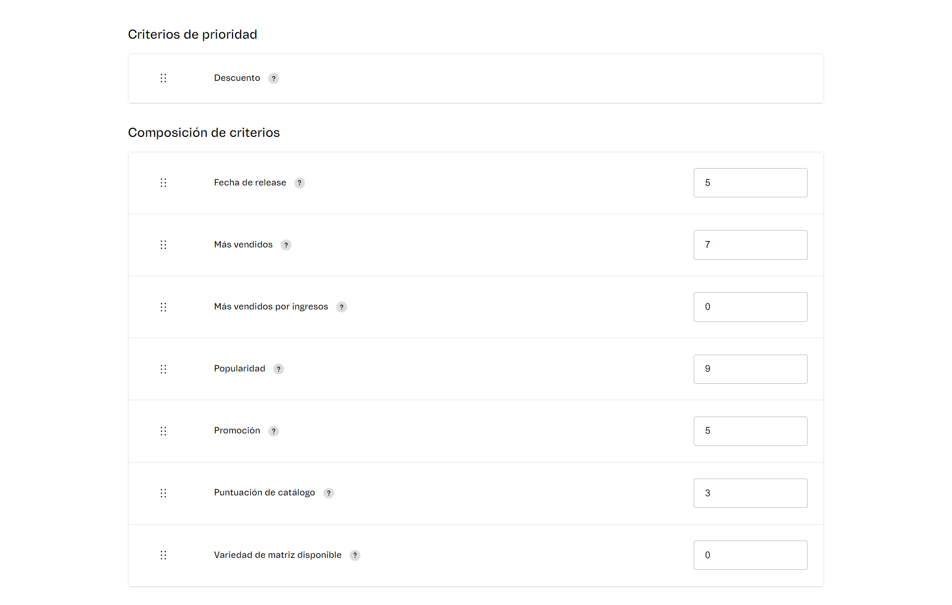 El conjunto de distribución de pesos y criterios genera una puntuación para el producto, lo que ayuda a su posicionamiento en el orden del resultado de la búsqueda.