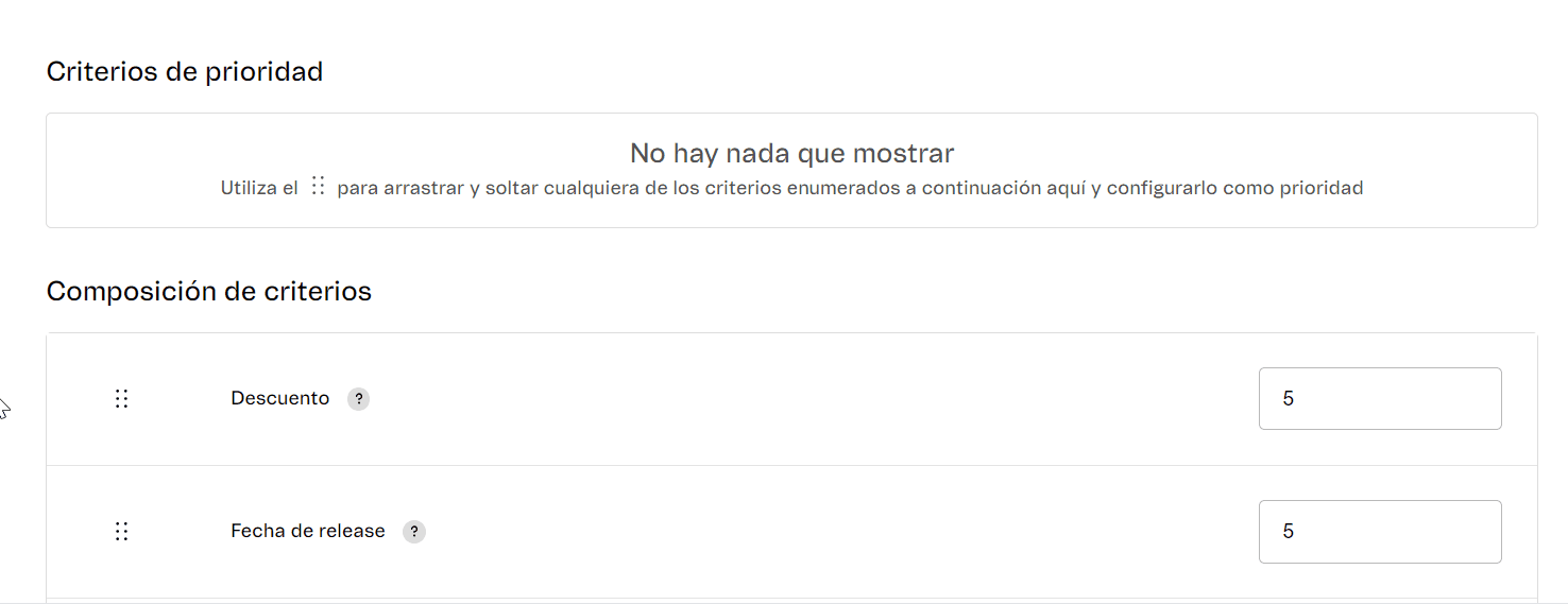 Si deseas utilizar criterios de prioridad, posiciona el más importante en primer lugar, ya que la clasificación siempre se basará en este. El primer criterio de prioridad tiene más peso que los demás, por lo que puede anular los otros criterios de prioridad y la composición de criterios. En caso de empate, se tomarán en cuenta los demás criterios para determinar el orden final de los resultados (primero los otros criterios de prioridad y luego la composición de criterios).