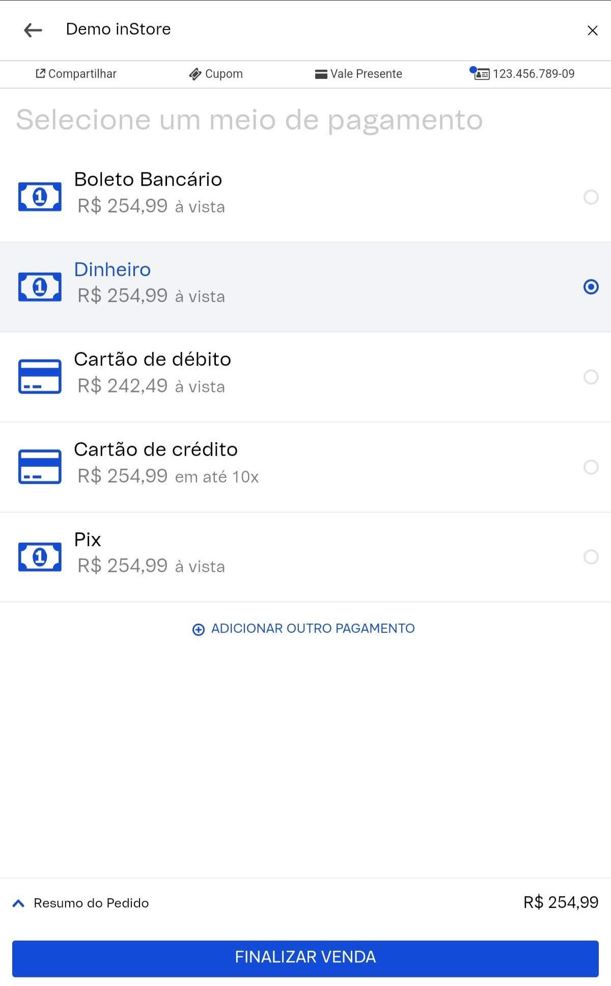 Para prosseguir, é necessário selecionar um ou mais meios de pagamento desejados e clicar em Finalizar venda.