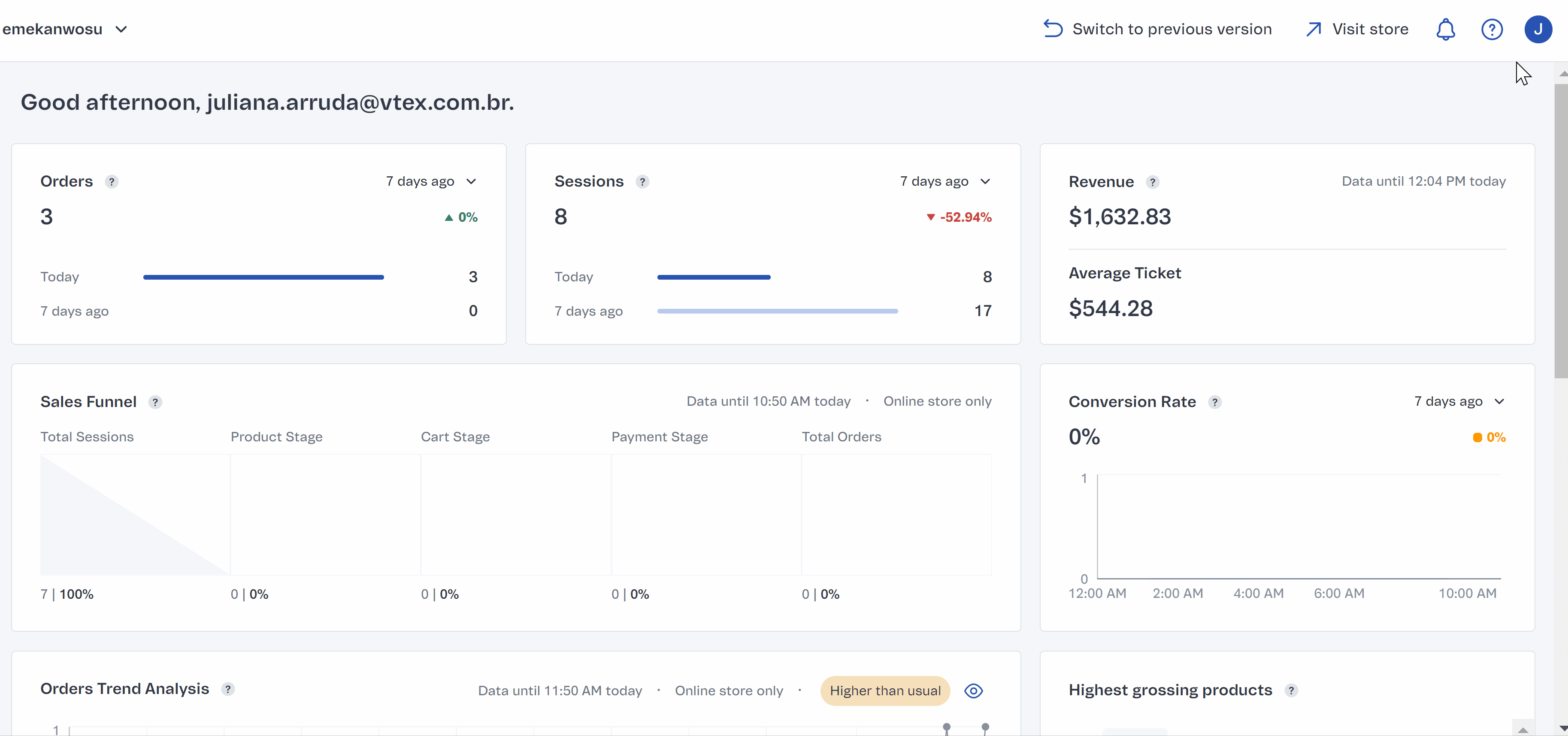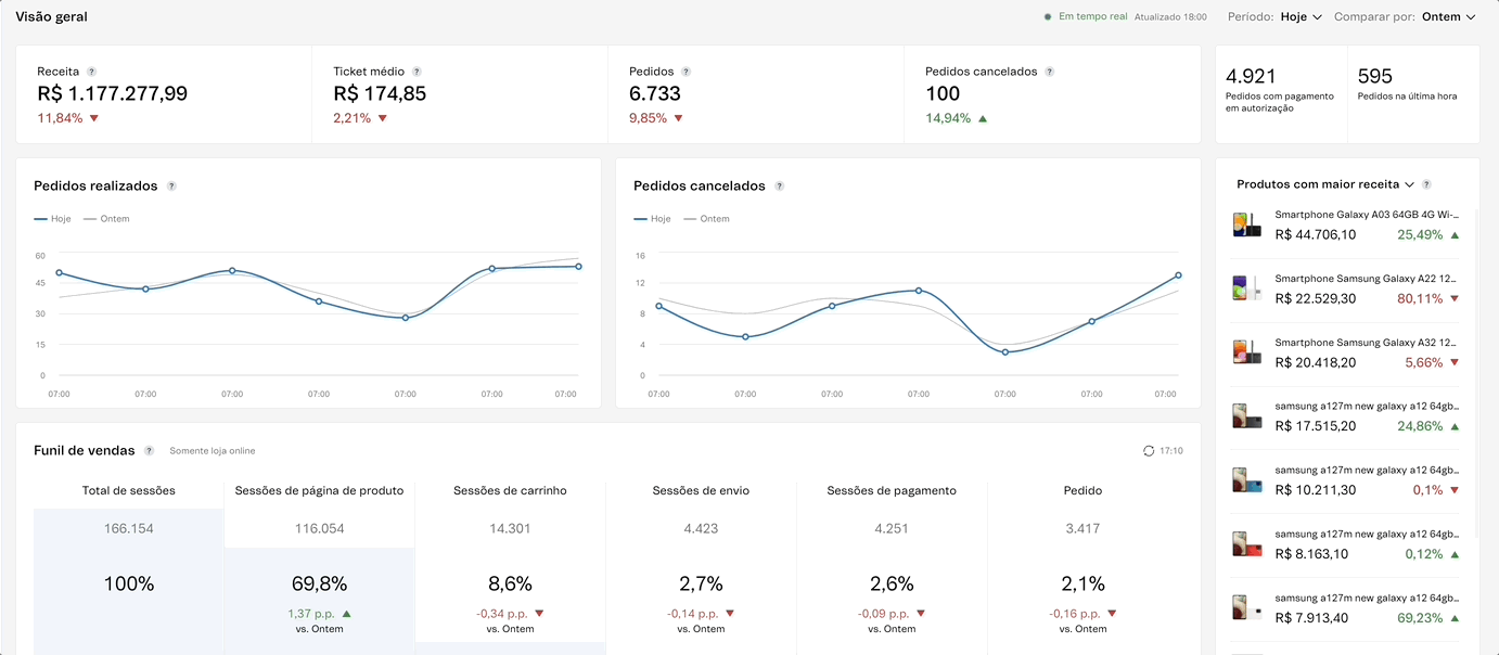 Assim que você fizer login no Admin, verá métricas e gráficos úteis para monitorar o desempenho da sua loja, como a receita gerada e o número de pedidos, o funil de vendas e a taxa de conversão, além dos 10 produtos que geram maior receita.