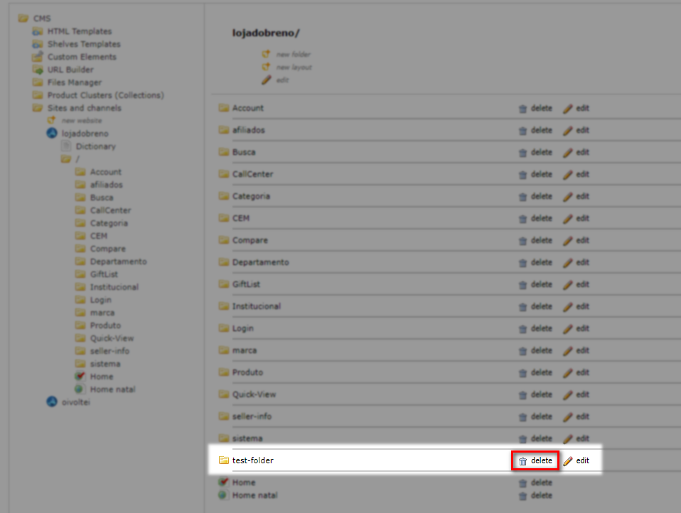 Para apagar uma pasta do CMS, siga os passoa abaixo: