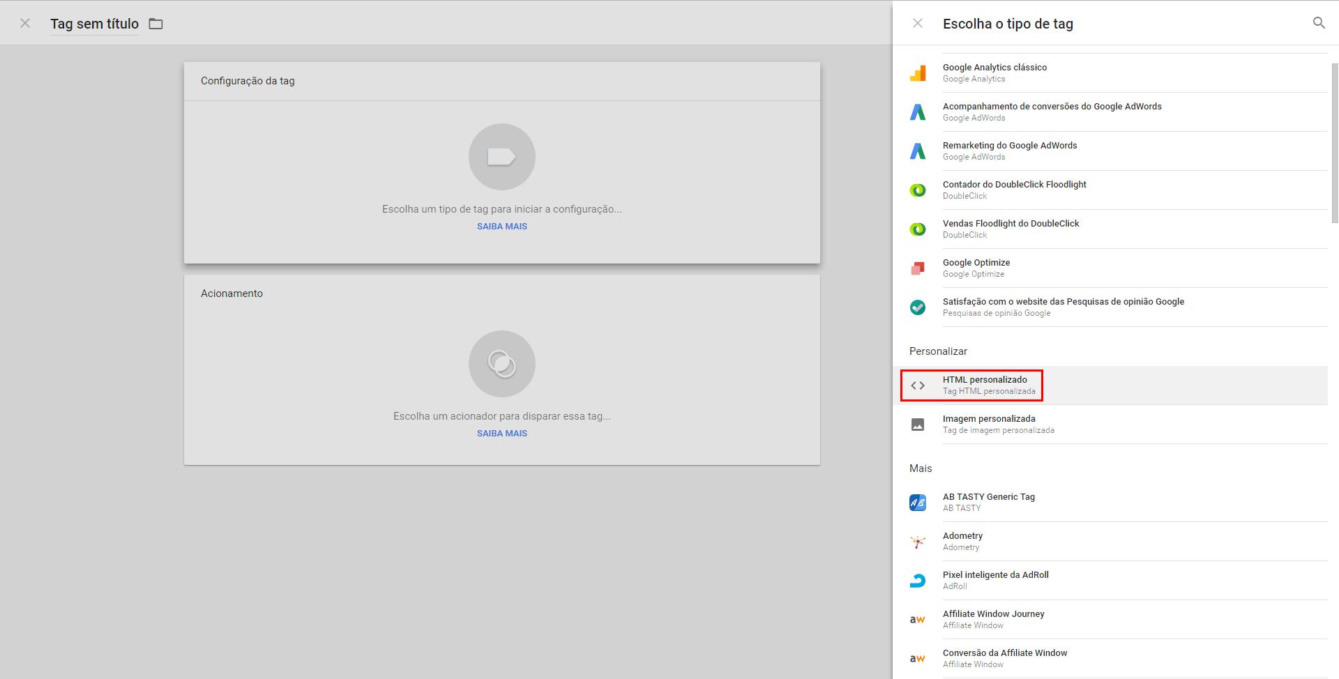 2. Selecione Configuração da tag e escolha o tipo HTML personalizado.