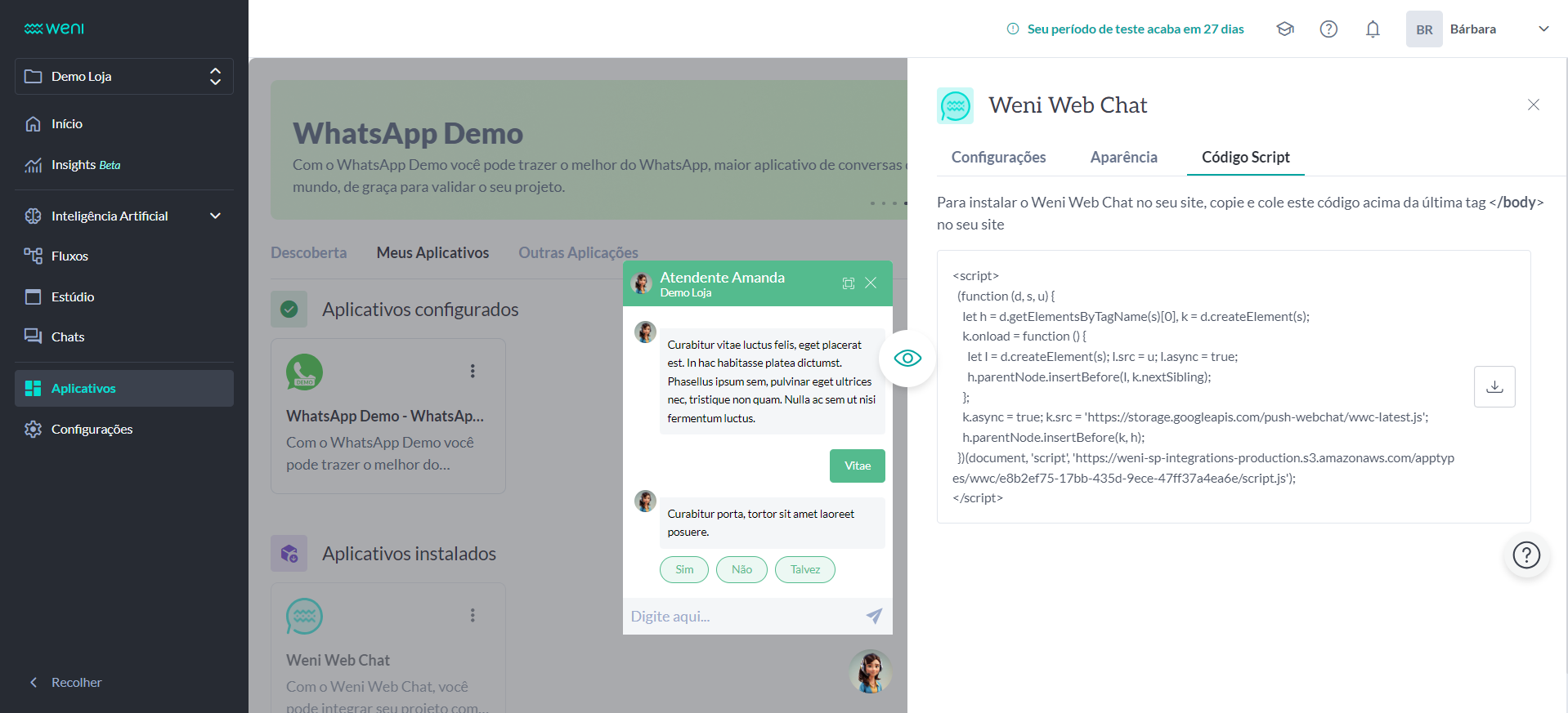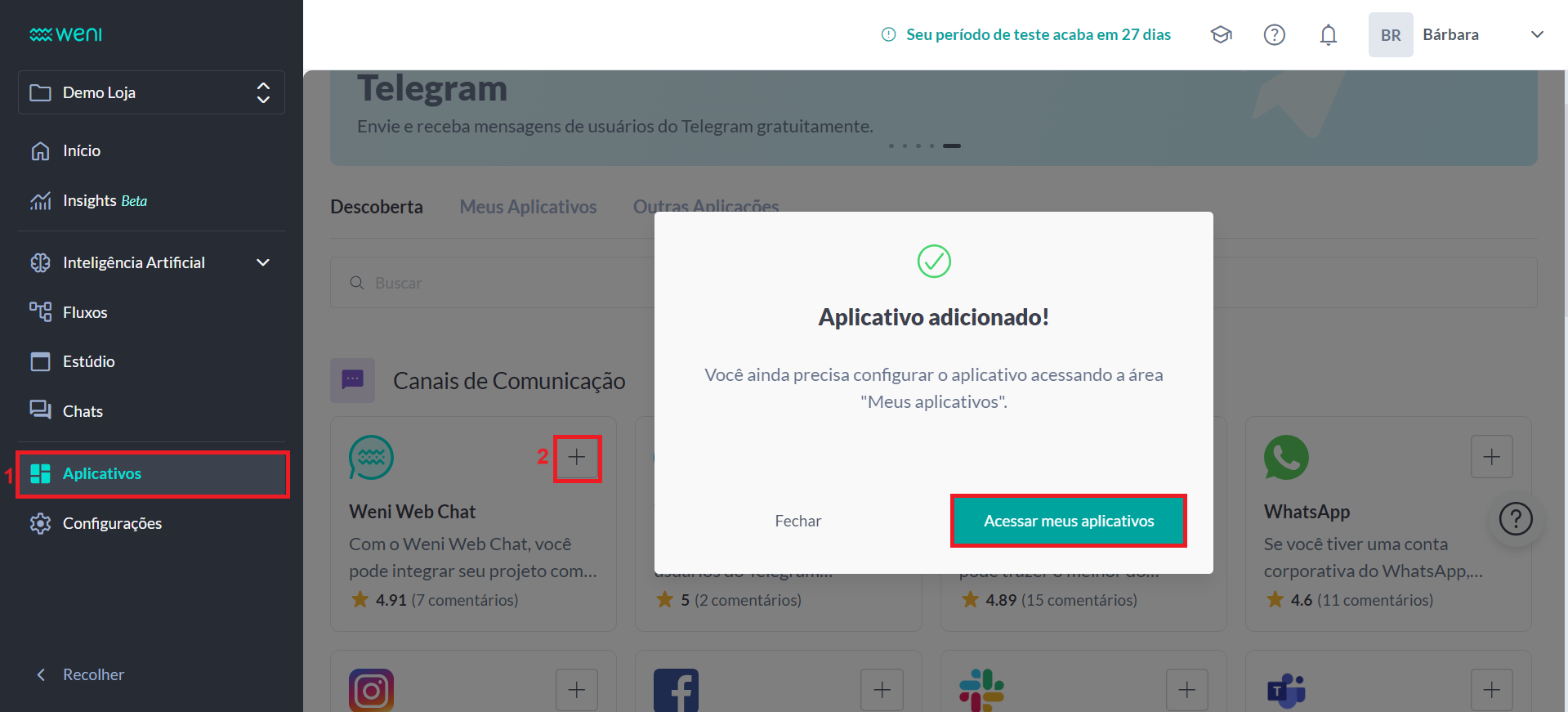 - Ao clicar em Aplicativos > Descoberta, você seleciona a opção Weni Web Chat.