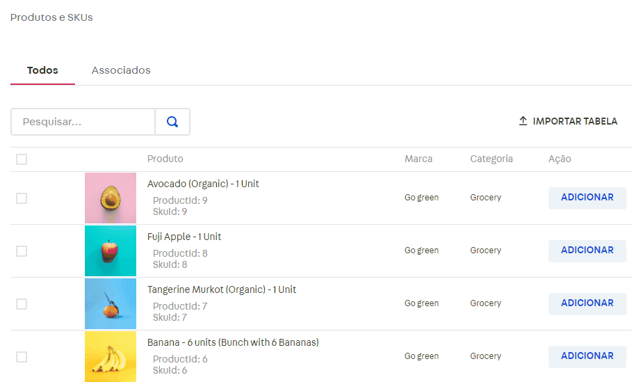 Na lista Todos, você tem acesso a todos os produtos e SKUs do catálogo da sua loja. Para realizar uma pesquisa, você pode digitar a ID do produto ou do SKU na barra de busca.