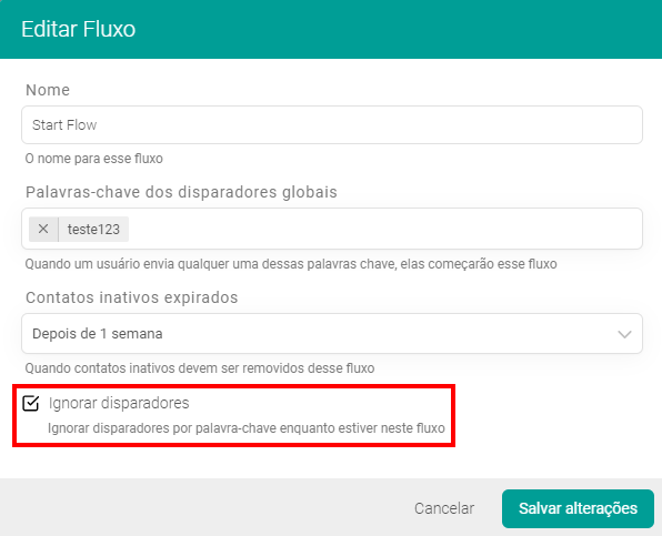 Para configurar um fluxo para ignorar gatilhos e palavras-chave enquanto um contato ainda estiver participando, basta ajustar as configurações adequadamente.