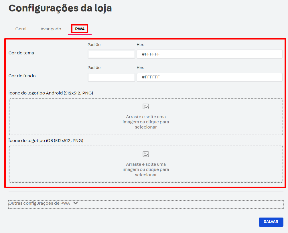 1. Em Outras configurações de PWA, preencha os campos conforme orientações abaixo: