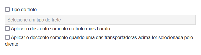Caso você habilite somente a opção Tipo de Frete e selecione os tipos de frete desejados, o desconto de frete será aplicado a todos os tipos de frete selecionados.