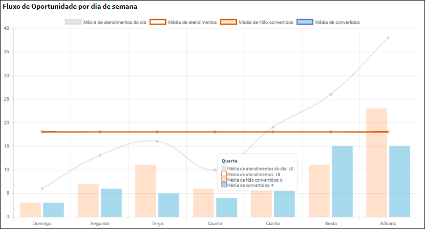 Além disso, é possível acompanhar a taxa de conversão por meio de gráficos e tabelas que comparam o número de atendimentos com o número de conversões.