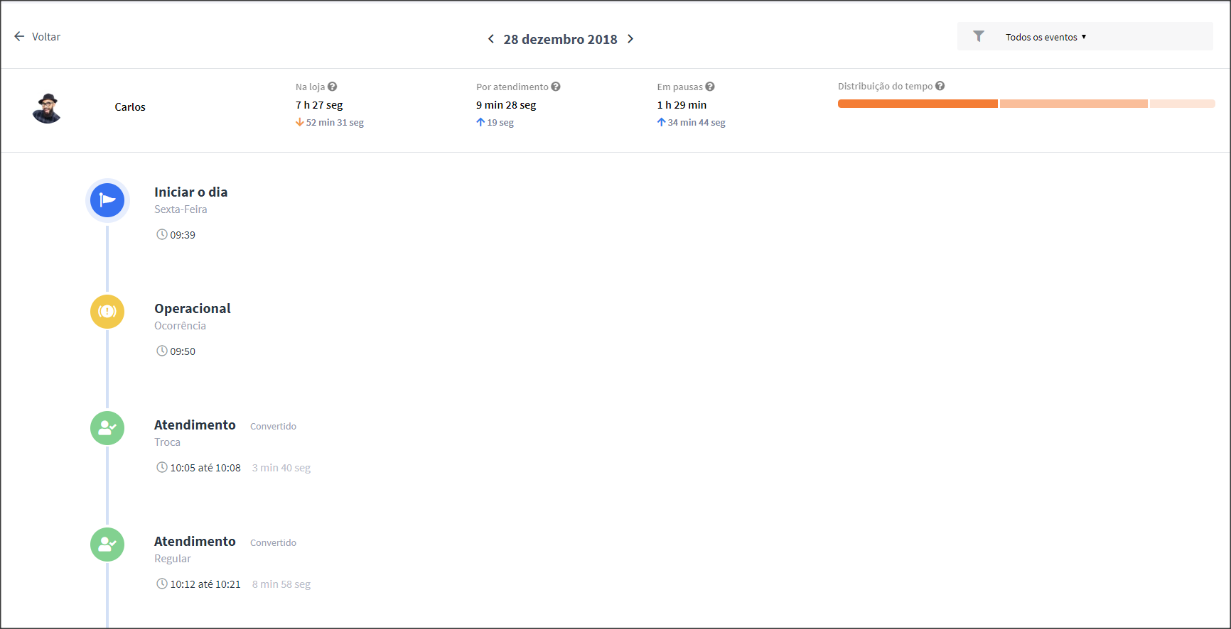 A barra de distribuição apresenta a divisão do tempo médio entre atendimentos, fila de espera e pausas, tanto para a loja quanto para cada vendedor individualmente.