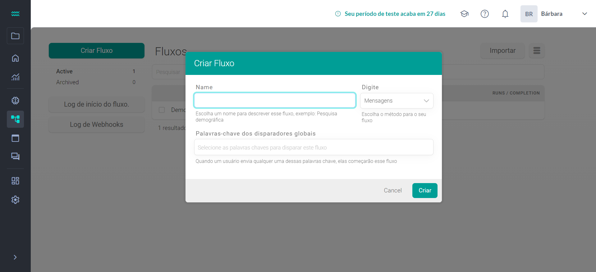 - Depois disso, um pop-up para criação de fluxo irá aparecer na sua tela. Ele é formado por três campos que podem ser preenchidos: Nome , Palavras-chave dos disparadores globais , Digite