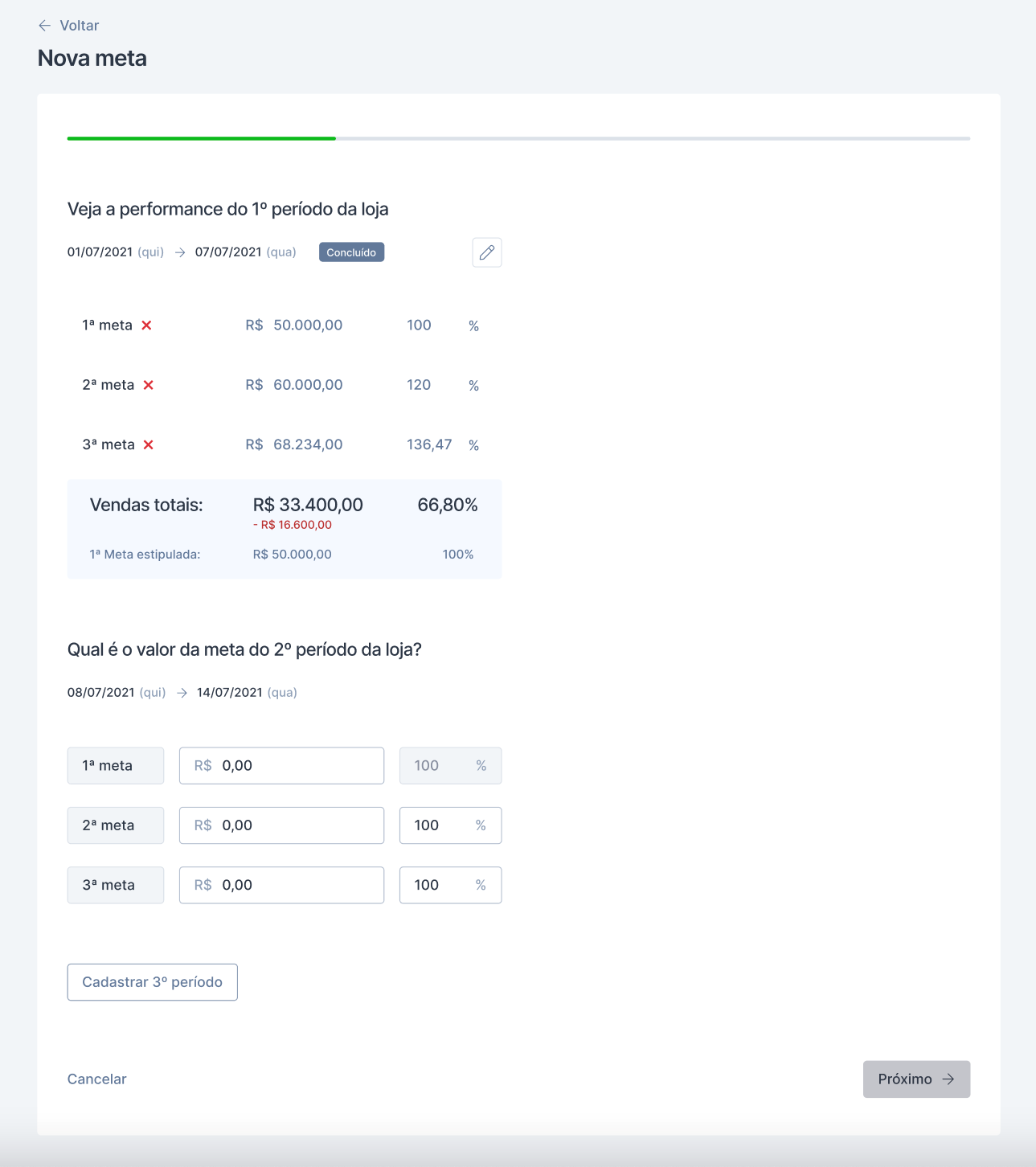 É permitido cadastrar no máximo cinco metas por período. Em casos em que o ciclo da meta consiste em apenas um período, a primeira meta configurada será o valor total desse ciclo.