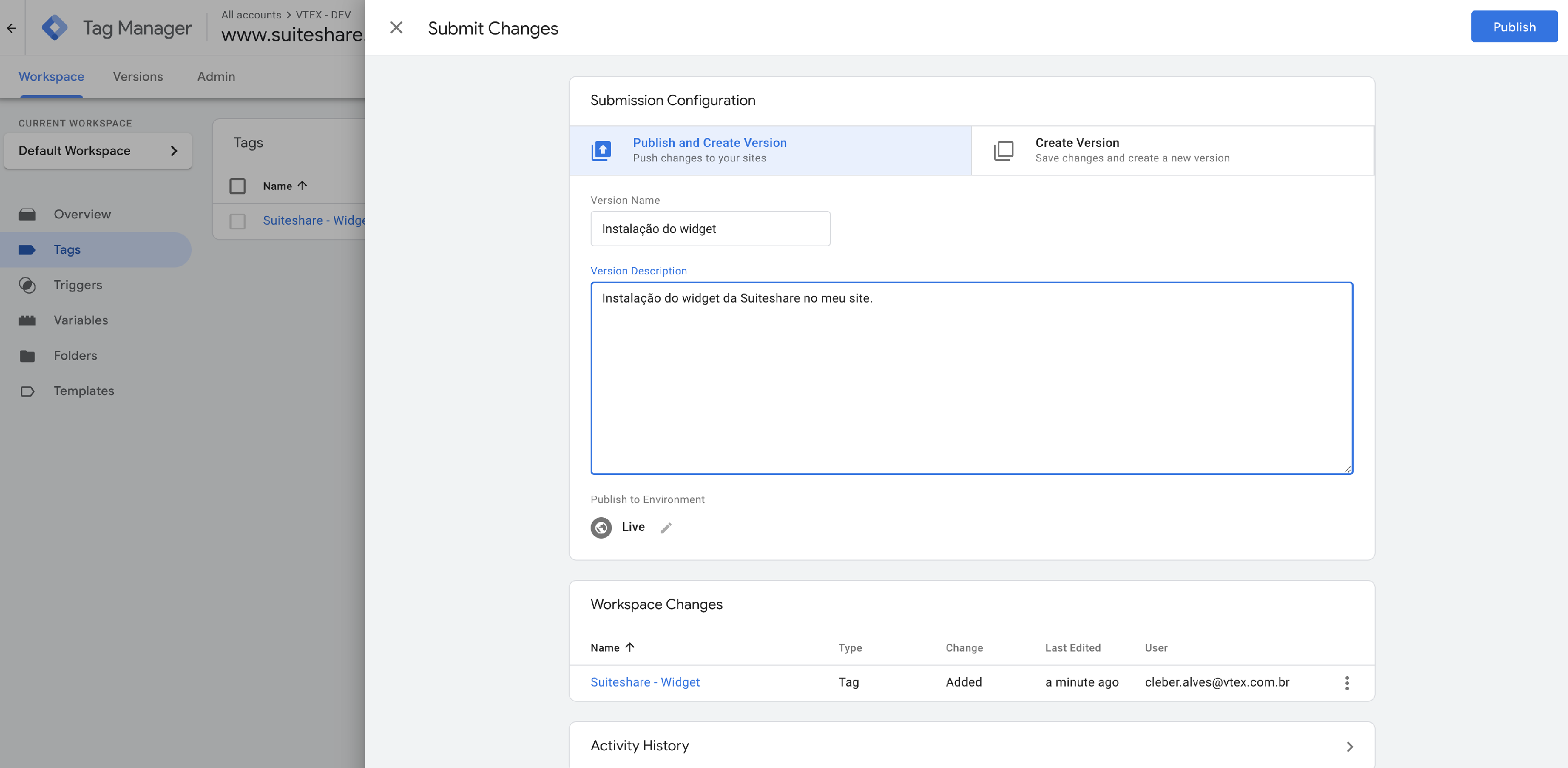 Clique no botão Save a direita, para salvar sua tag de instalação do widget VTEX Assisted Sales (SuiteShare).