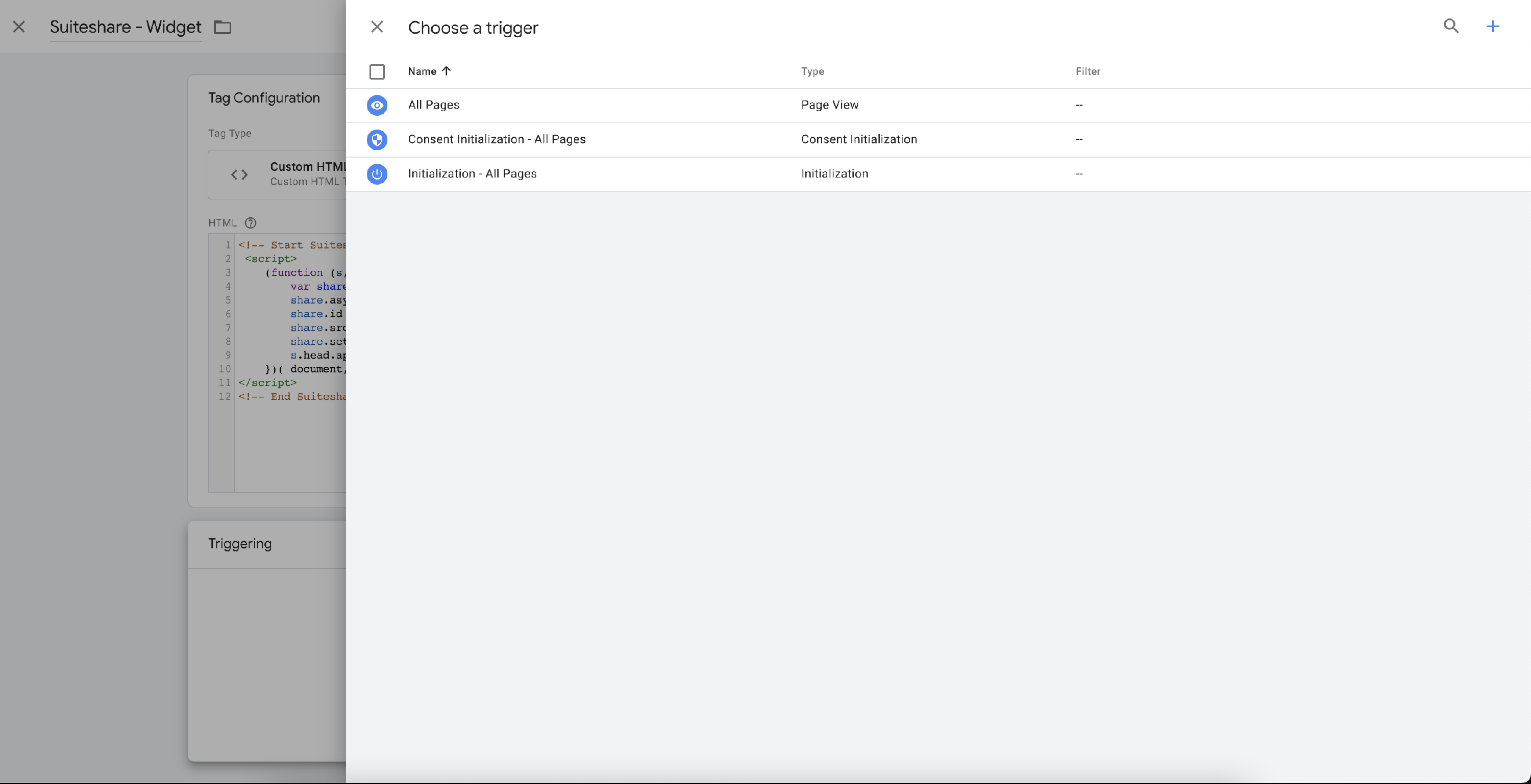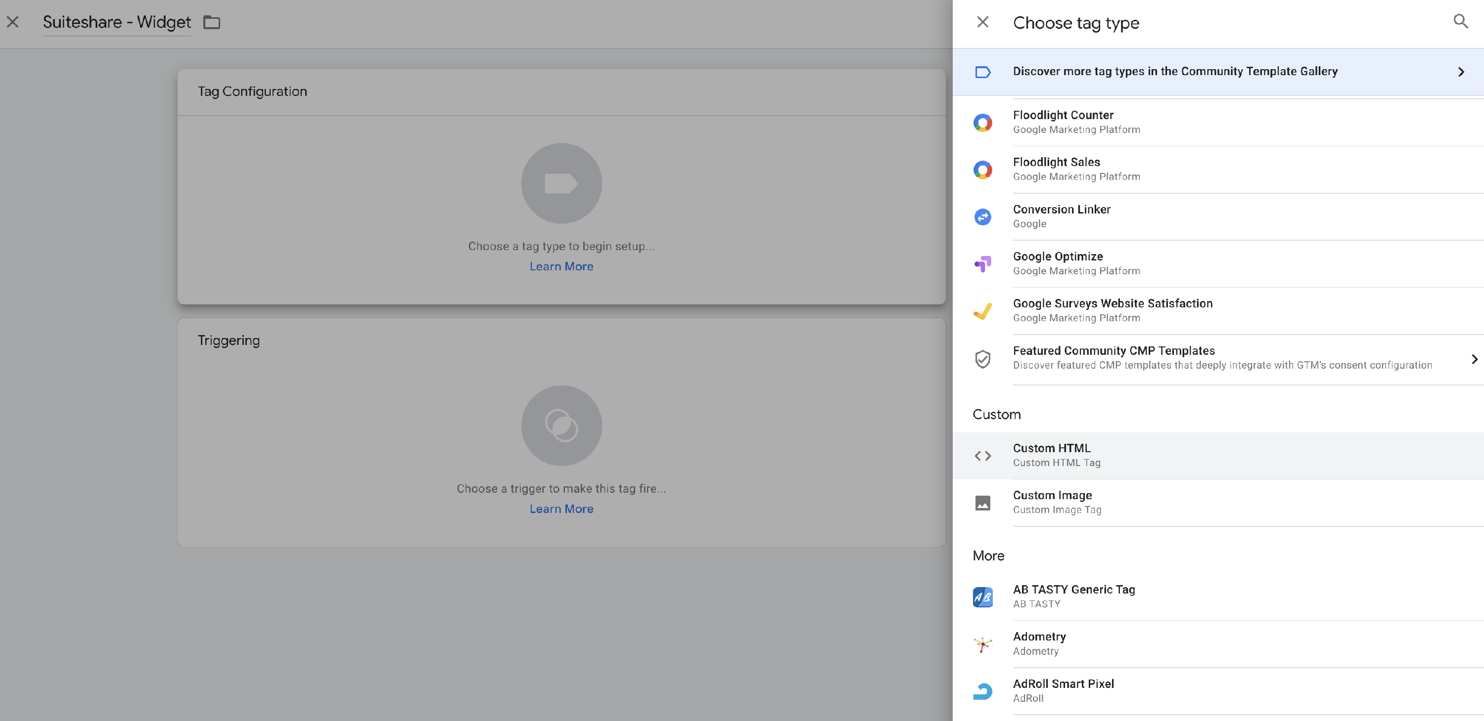 Na tela abaixo, defina um nome para a tag (ex: VTEX Assisted Sales (SuiteShare) - Widget) e clique em Choose a tag type to begin setup para configurar a tag.