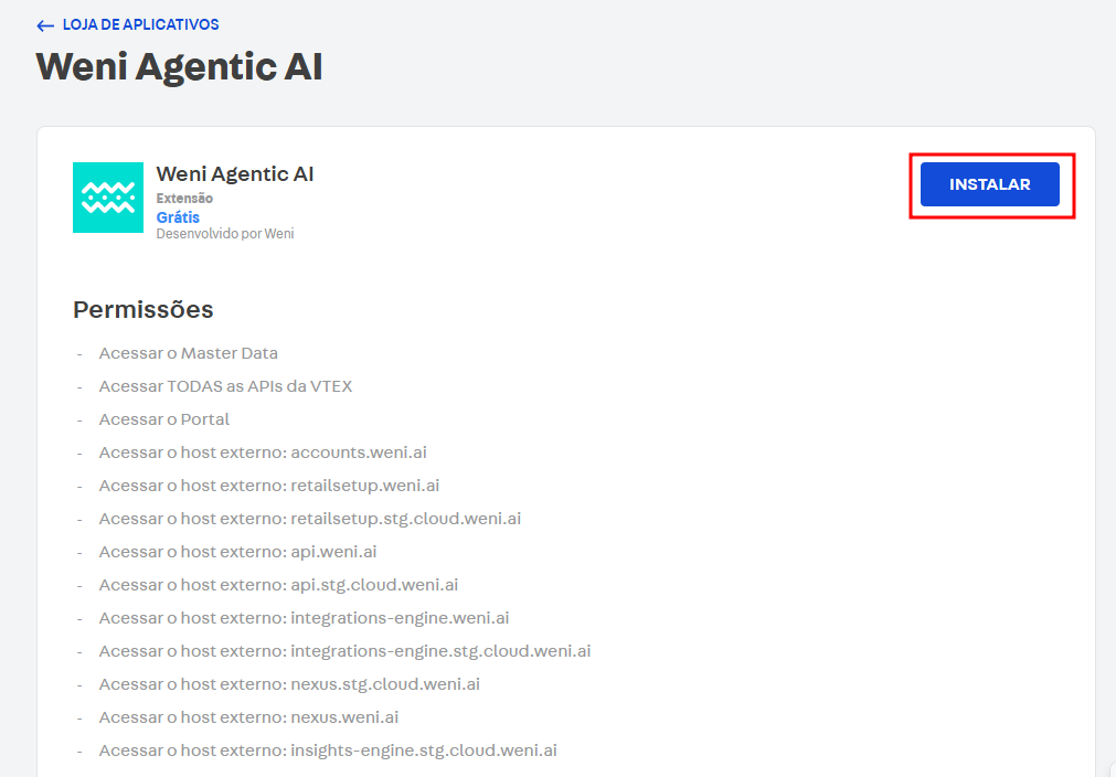 Para realizar a instalação você deve acessar o seu ambiente VTEX e deverá procurar pelo módulo de Aplicativos, após isso busque por loja de aplicativos e tente procurar por Weni Agentic AI. Fazendo isso, será possível encontrar o App da Weni, como segue a imagem abaixo.