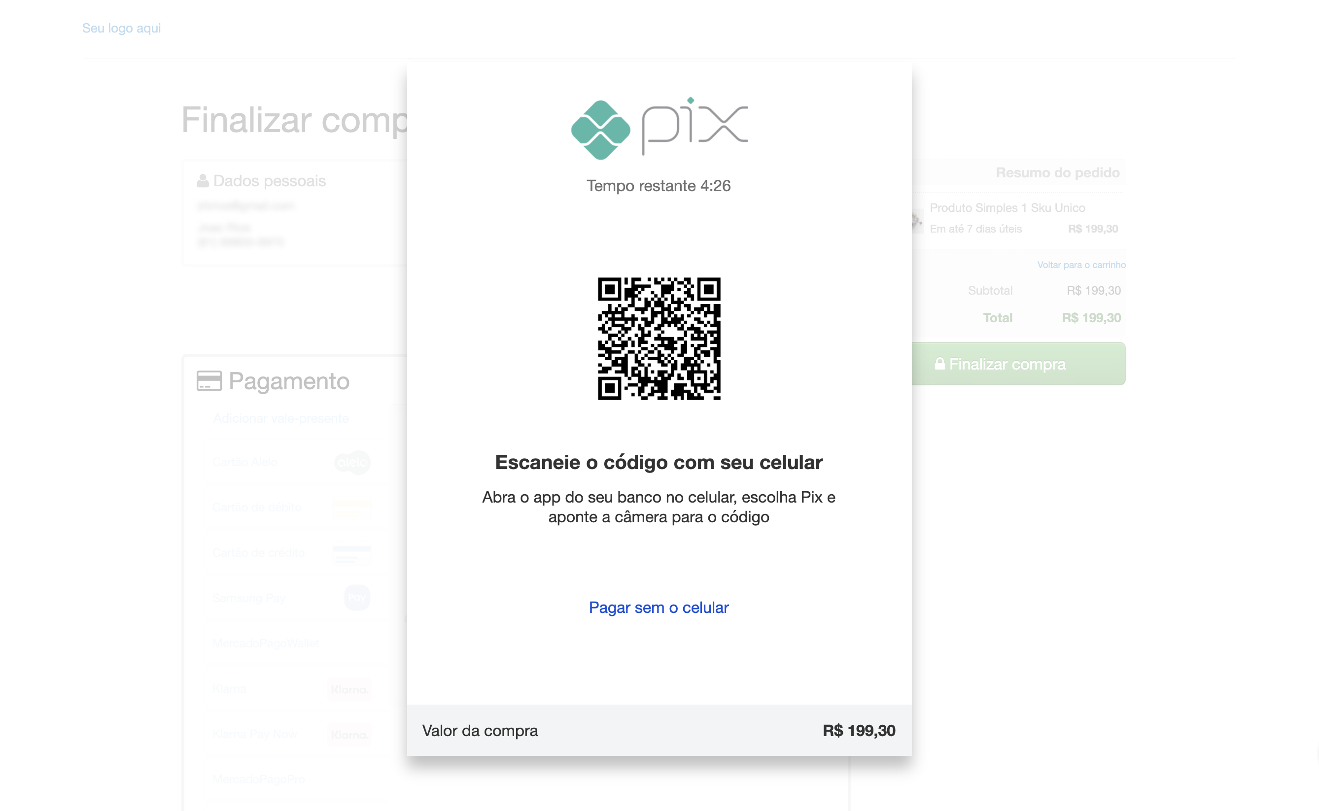 Quando o usuário clicar no Pix, um QR Code que comporta as informações da compra será gerado. A partir daí, o usuário tem dez minutos para efetuar a transação com a sua instituição financeira de preferência.
