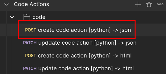 Para realizar a criação do tipo JSON, você poderá encontrar uma requisição chamada create code action [python] -> json, como segue na imagem abaixo.