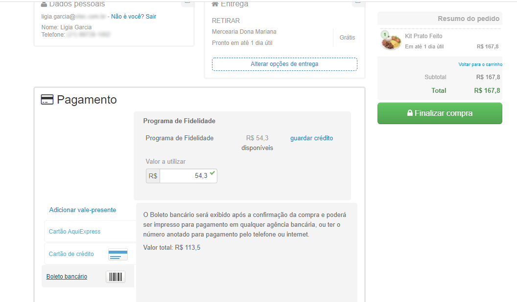 Observe que o valor será descontado da outra forma de pagamento selecionada. No exemplo a seguir, o boleto passou a ter o valor de R$ 113,50, que corresponde a R$ 167,80 menos o valor fidelidade utilizado (R$ 54,30).