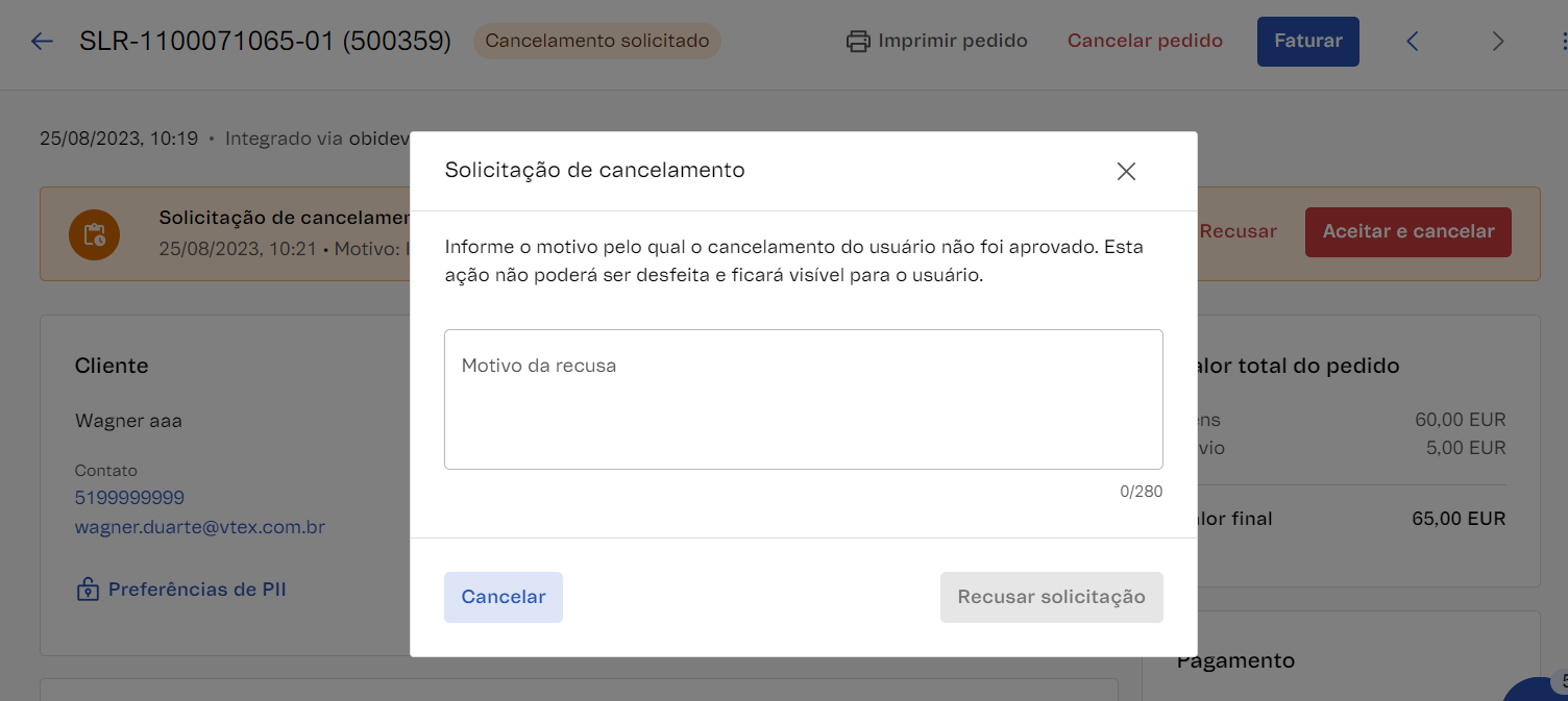 1. Preencha o pop-up Solicitação de cancelamento com o motivo da recusa da solicitação de cancelamento do pedido.