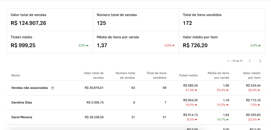 Performance de vendas é uma página do VTEX Sales App que permite que lojistas e vendedores tenham acesso às métricas de vendas da loja, tornando possível a comparação de performance entre períodos de venda e desempenho de funcionários.
