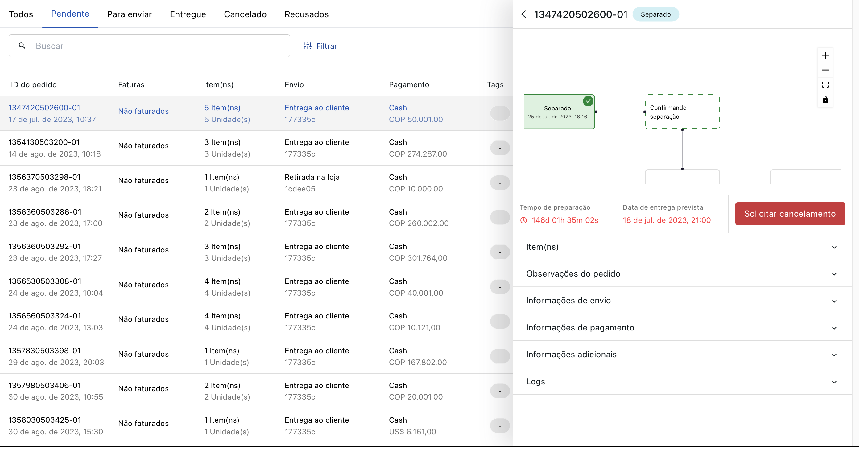 • Pendente: pedidos pendentes, em separação de itens e em preparação.