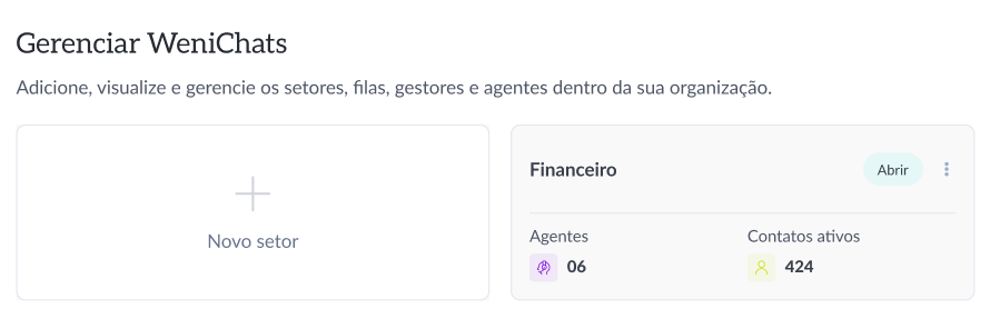 Para que um agente possa utilizar o Chats é necessário que esteja inserido em um setor, setor é como é chamado um grupo de atendimento, cada setor é composto de pelo menos um gerente, uma fila, um agente.