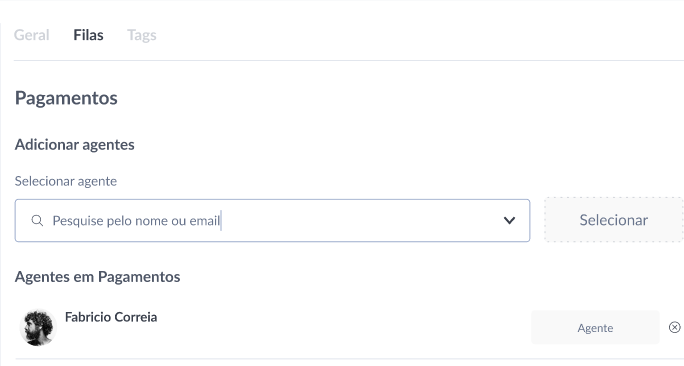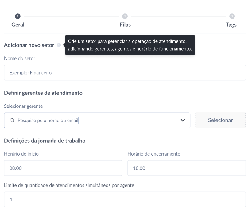 No setor é onde é definido o horário de funcionamento do atendimento humano, o limite de atendimento simultâneos por agente, e é possível adicionar tags para que os agentes ao finalizar um atendimento classifiquem o chat de acordo com o assunto, facilitando pesquisas e relatórios posteriores.