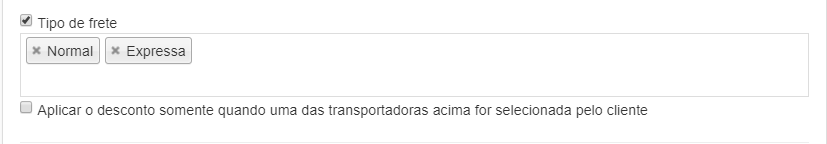 Você também pode ativar a flag Aplicar o desconto somente quando uma das transportadoras acima for selecionada pelo cliente. Neste caso, a promoção será aplicada somente após o cliente selecionar alguma forma de entrega.