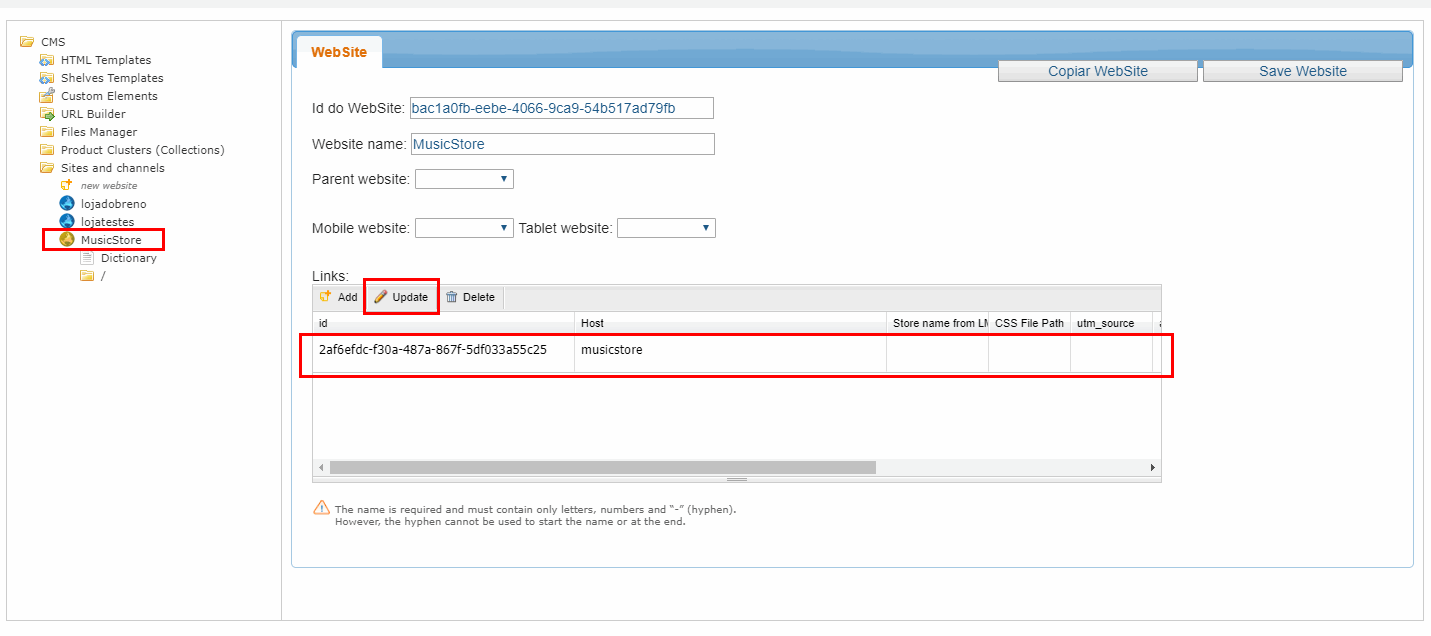 - Selecione o Binding (linha selecionada na imagem abaixo), e clique em Update.