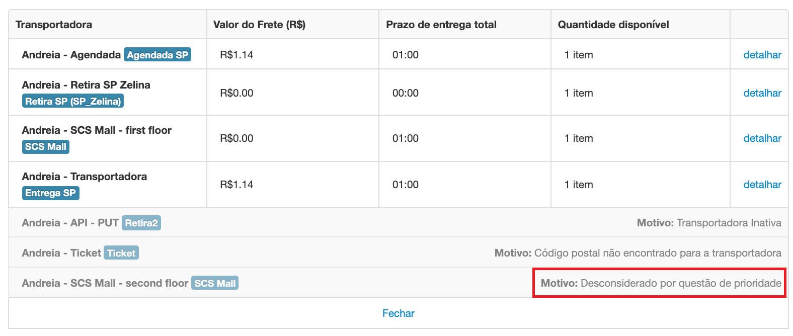 Nesse caso, o módulo de logística desconsiderou os pontos de retirada pelo seu algoritmo de priorização. Durante esse processo, apenas um dos métodos de envio de mesmo nome é apresentado ao comprador. Saiba mais nesse artigo sobre divergência entre políticas de envio.