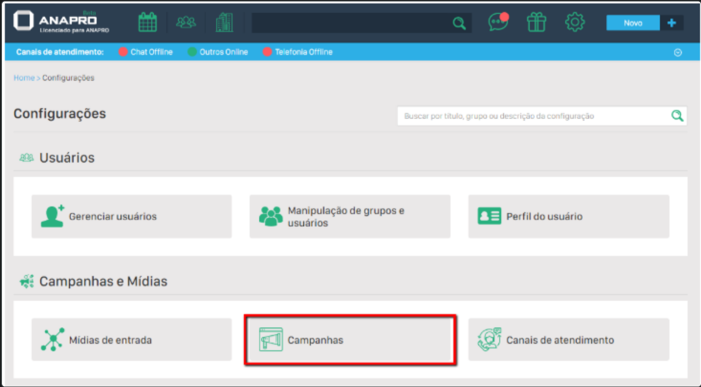 Agora, acesse o menu  "Configurações>Campanhas".