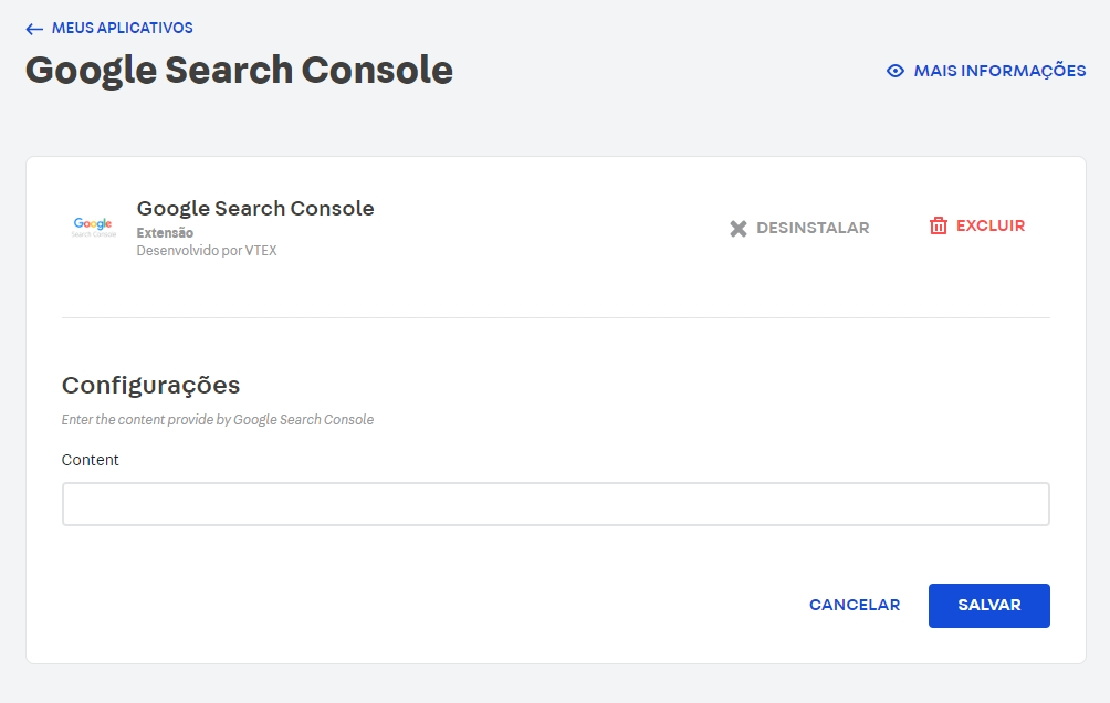 1. No campo Content, adicione apenas o conteúdo após a flag content da metatag que copiou do Google Search Console anteriormente. Por exemplo, se a sua metatag for o seguinte <meta name="google-site-verification" content="{contentID}" />, adicione no campo Content apenas o que está dentro de {contentID}.