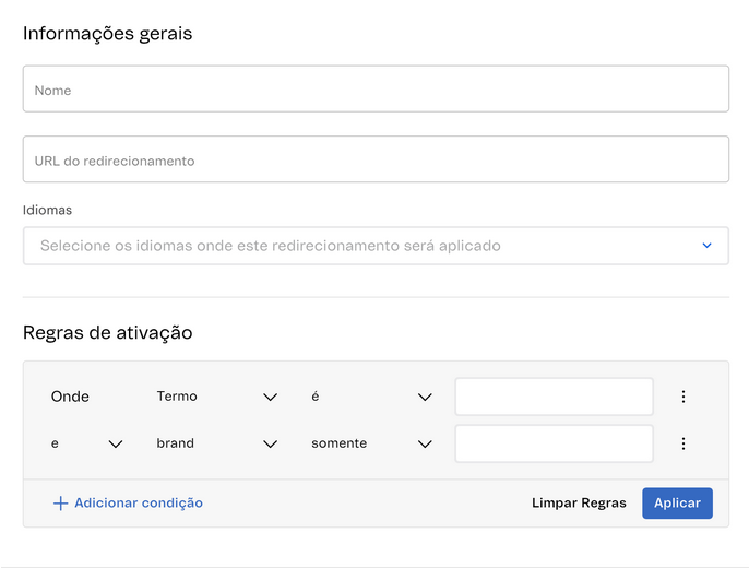 • Idiomas: idiomas aos quais o redirecionamento será aplicado. Campo disponível apenas para lojas que utilizam Configurações Multi-idioma (Beta).