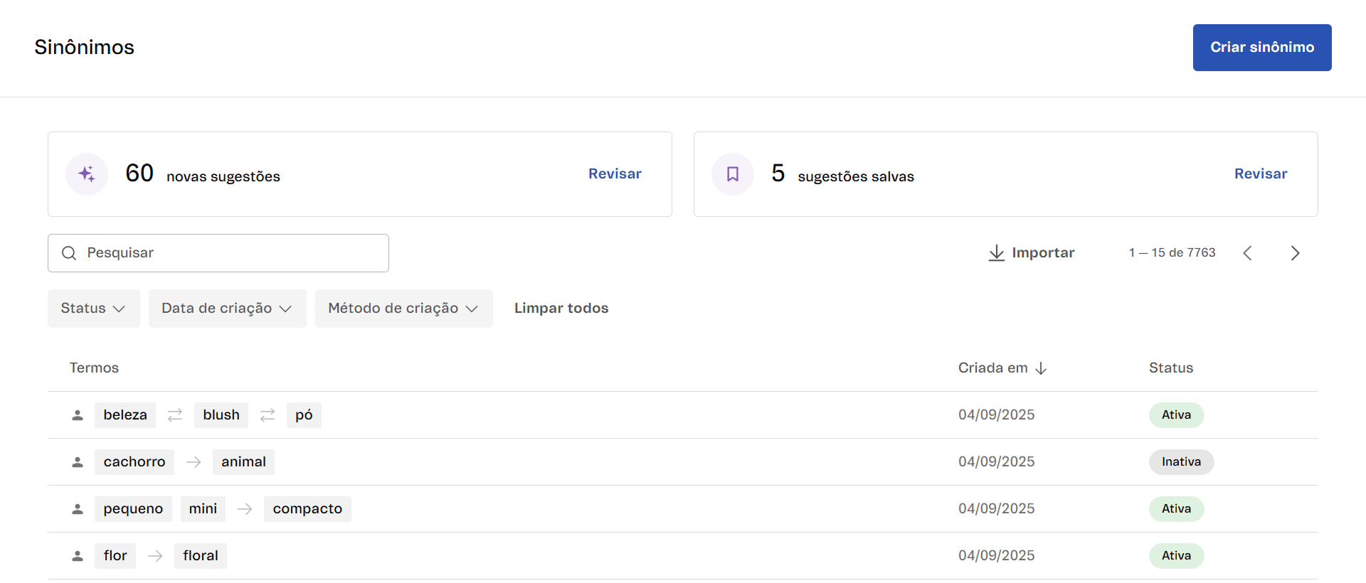 Existem duas formas de configurar sinônimos no Admin VTEX: individualmente ou por importação de uma planilha em formato CSV. Se você precisa cadastrar sinônimos em massa, recomendamos utilizar a planilha. Confira as instruções para cada forma de configuração nas seções a seguir.